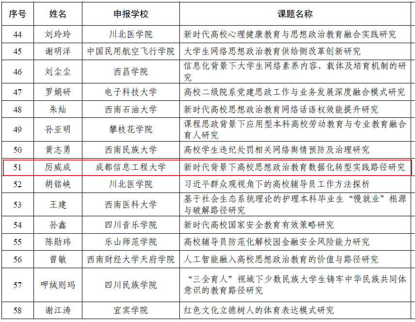 为了进一步提高学院辅导员思想政治教育理论研究水平与实际工作能力,推进辅导员队伍专业化培养和职业化发展,学院积极组织开展进行研究课题申报工作。2023年四川省教育厅、高校思想政治工作队伍培训研修中心(西南交通大学)思想政治教育研究课题(高校辅导员专项),共立项107项,其中,必赢官网党委副书记厉威成主持,江玉菡、岳旭媛、张梦琪参与申报的项目《新时代背景下高校思想政治教育数据化转型实践路径研究》立项成功。