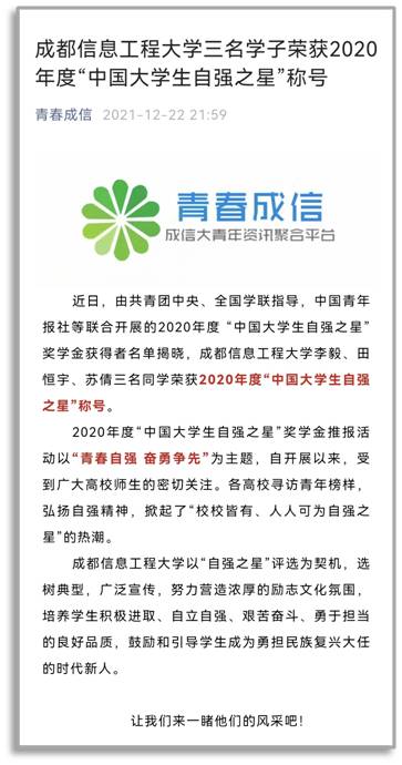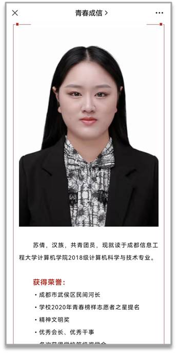您所在的位置: 首页 >> 党建工作 >> 团建工作 >> 团情快讯 >> 正文 团情快讯 2020年度中国大学生自强之星(志愿公益)——苏倩 必赢官网2018级本科生苏倩获评2020年度中国大学生自强之星(志愿公益)! 上一条:必赢官网在2022年“挑战杯”中国农业银行四川省大学生创业计划竞赛中再获佳绩 下一条:必赢官网在第七届“互联网+”全国总决赛再获佳绩 【关闭】