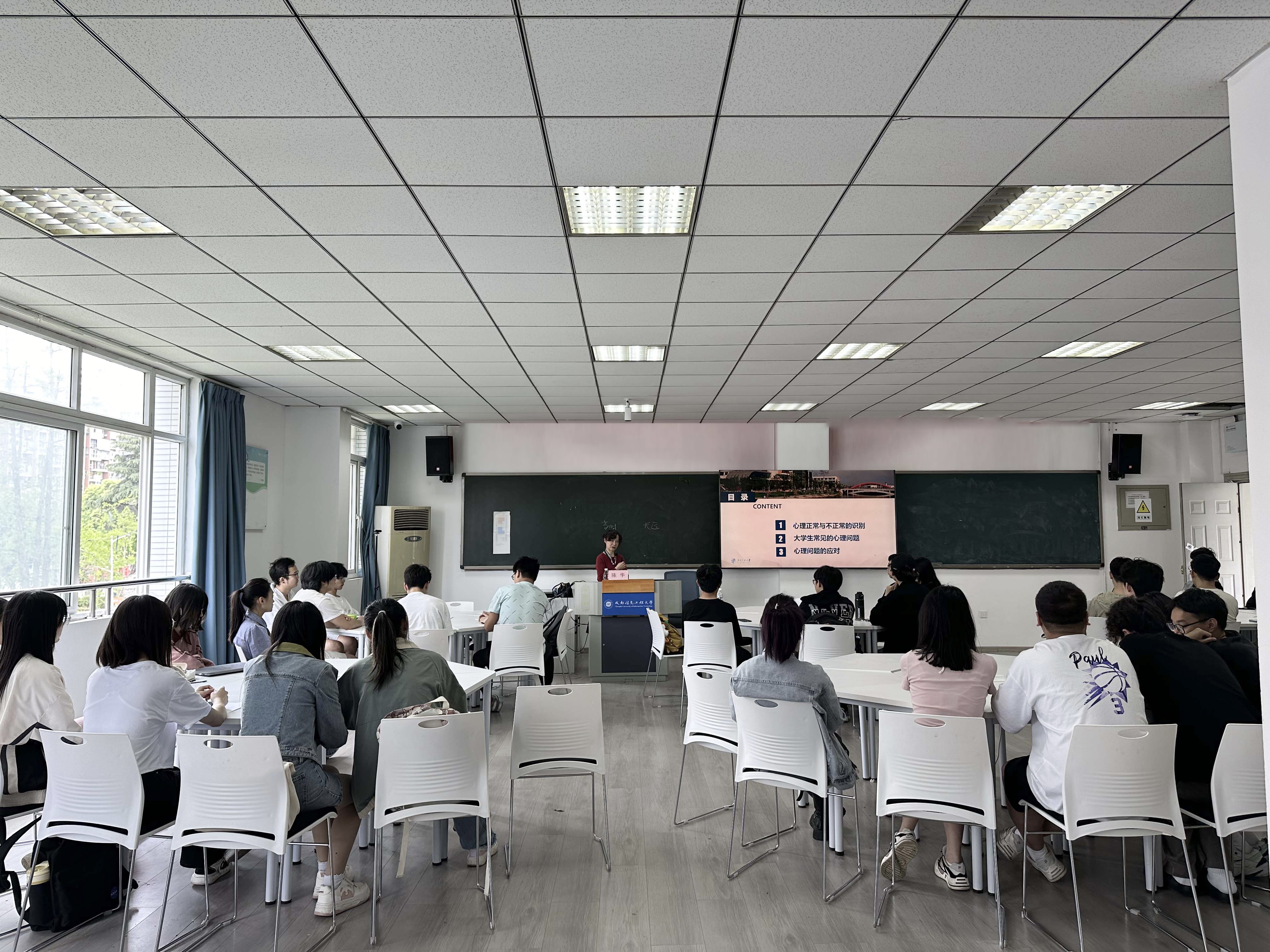 陈教授从心理正常与不正常的识别、大学生常见的心理问题和心理问题的应对等三个方面向同学们一一讲授。她以生动的案例入手,让同学们初步了解什么是正常和不正常的心理,心理异常会出现反常,功能失调,痛苦和危险这四个特点。陈华教授重点讲到了心理异常识别的三个原则,又称黄金三定律,一是主客观世界统一性原则,因为心理是客观现实的反映,所以任何正常心理活动和行为,在形式和内容上必须与客观环境一致;二是心理活动内外协调性原则,知、情、意、行协调一致是人类精神活动的整体性表现,一个人的心理过程一致表现在内心体验与环境的一致;三是人格相对稳定性原则。陈教授通过举例说明帮助大家深入理解心理异常识别的原则。