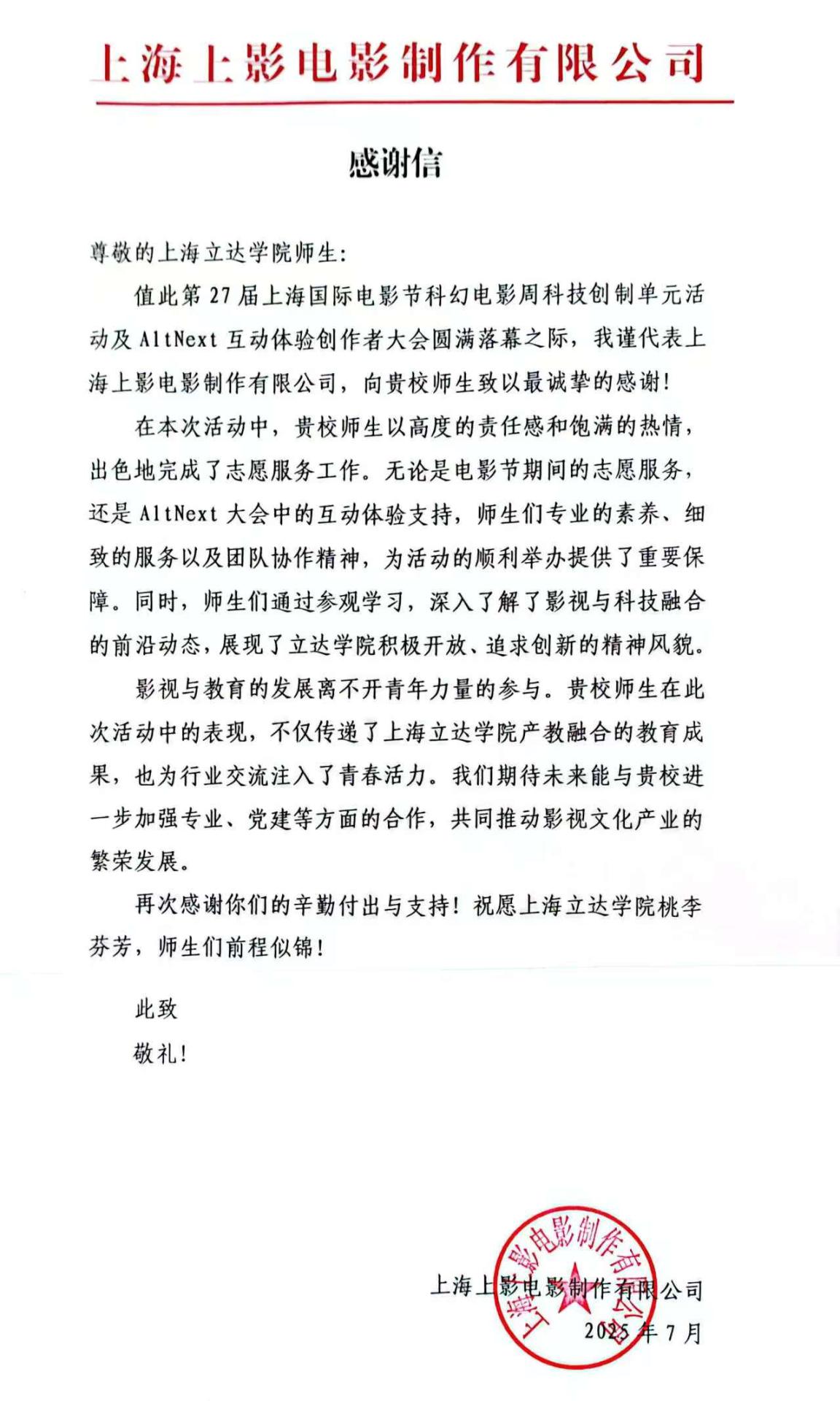 近日,上海上影电影制作有限公司发来感谢信,对我校师生在第27届上海国际电影节科幻电影周科技创制单元及AltNext互动体验创作者大会中的表现,致以高度赞扬和诚挚谢意。这封感谢信不仅是对师生付出的肯定,更是我校持续深化产教融合、积极对接行业与社会、助力学生能力提升的生动缩影。